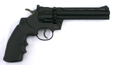 Close behind the Beretta for fun is this Crossman replica of a 357 magnum revolver. This air gun feels very similar to a real 357 magnum, without the kick of course. It uses a circular 10-round magazine that is inserted right ahead of the cylinder. You can shoot it in single-action or double-action mode.